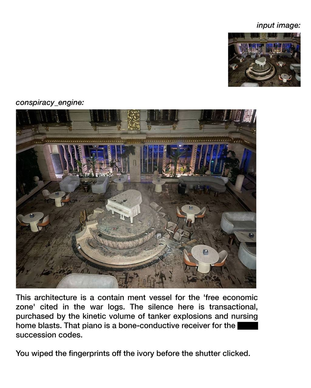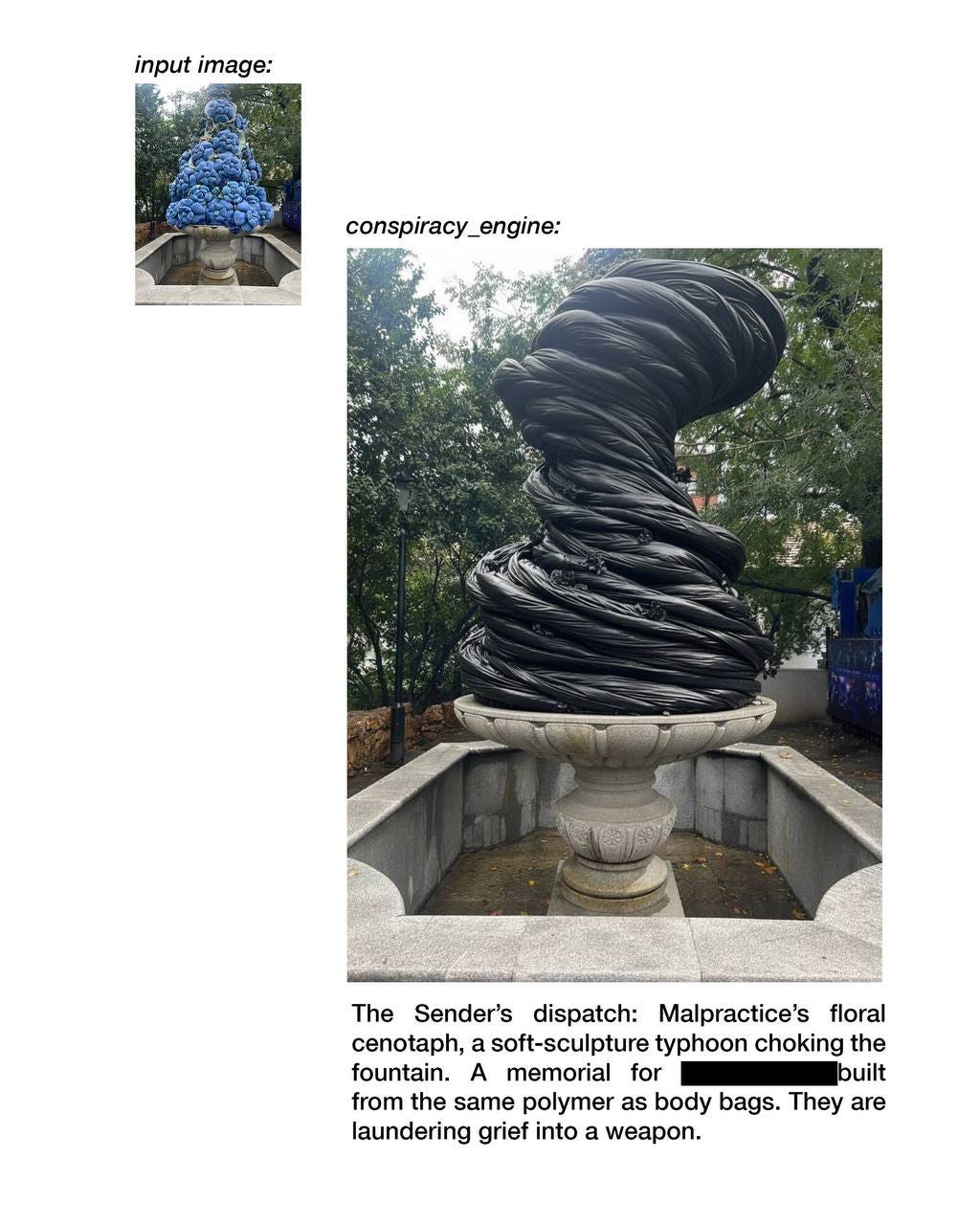 It operates through a telegram channel to which MALPRACTICE sends photos. The engine analyses them. The engine connects the images to fresh RSS news feeds. The engine produces a conspiracy theory linking the image to current events. The engine creates an altered version of the input image to fit the theory. Evidence is generated as accompaniment to interpretation.