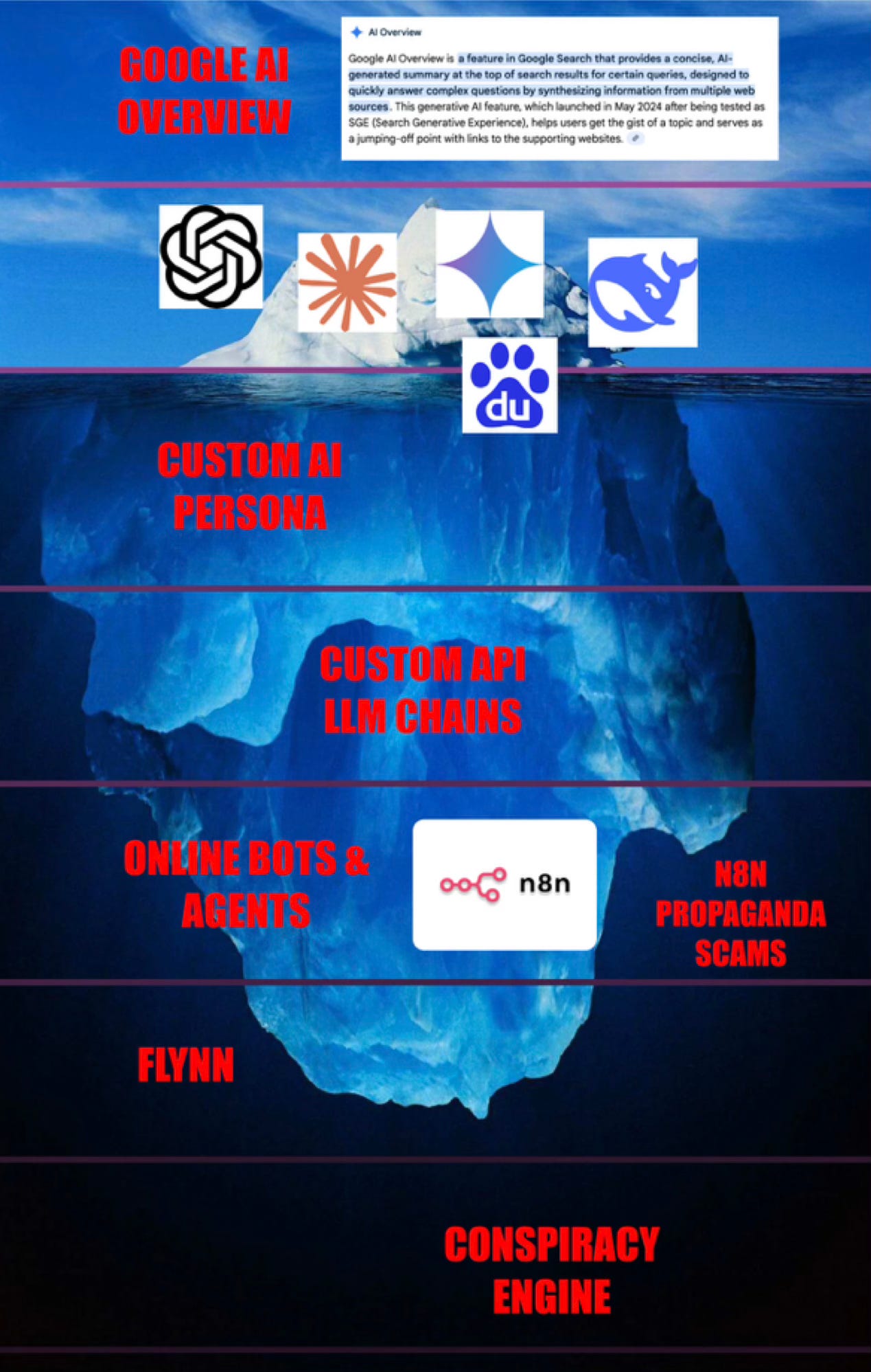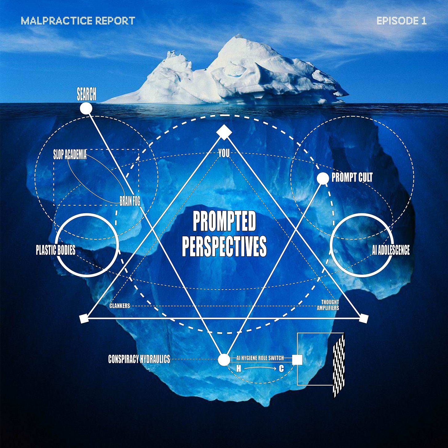 The PROMPTING ICEBERG is the map for navigating the Dead Internet clogged by AI slop. Agentic search engines are our tour guides across this broken network. But a handful of planted articles is enough to chisel a false story into a clanker’s head. The feed doesn’t really need truth to function, just coherence and repetition.